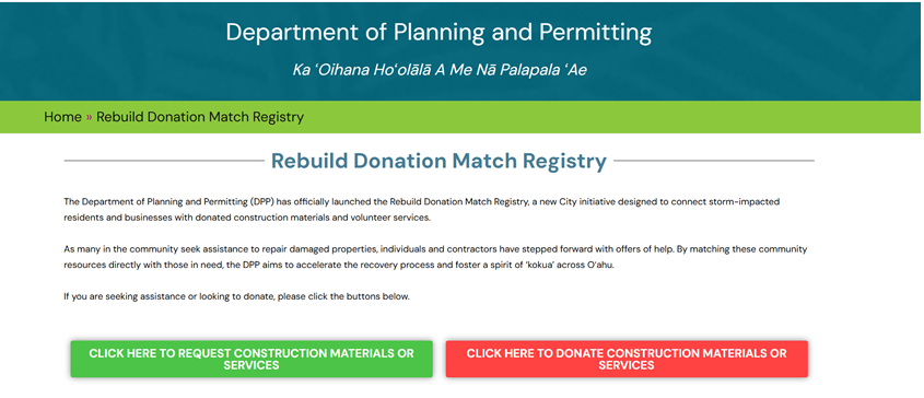 DPPʻs Rebuild Donation Match Registry connects storm-impacted residents and businesses with donated construction materials and volunteer services.