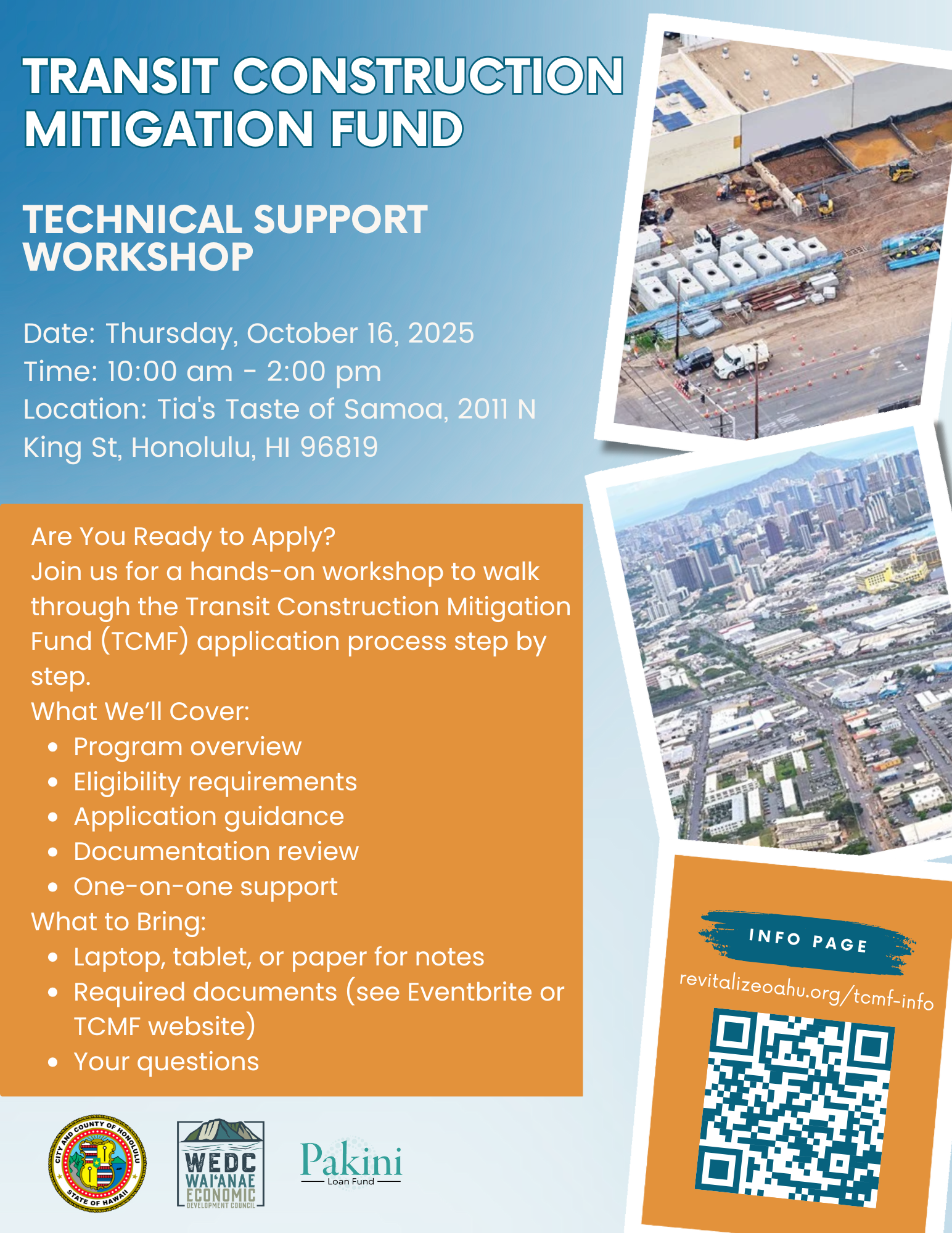 The Transit Construction Mitigation Fund (TCMF) will provide grant awards to eligible businesses impacted by the Honolulu Rail construction along Dillingham Blvd.